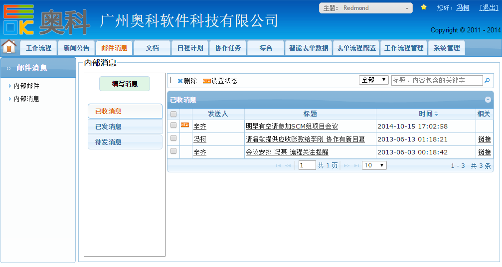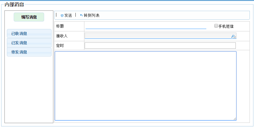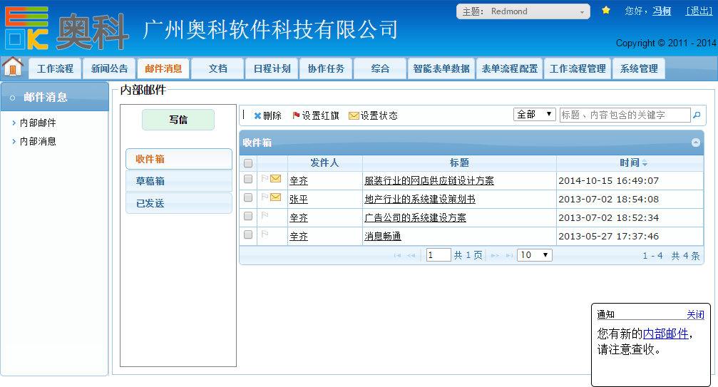 全面的消息体系奥科OA协同办公平台提供内部邮件、内部消息可用于即时传递消息。具体消息下发途径包括但不限于:网页、EIM即聊手机端、EIM即聊PC端、GSM短息猫、HTTP短信接口、PushMail下发等。 内部邮件内部邮件通常被称为OA邮件,是用于企业内部员工之间的邮件互发,是一种较为正式的快捷的沟通方式: ![]() 发送邮件的方式,与常规的网页版邮箱发送邮件的方式类似,可以包括图文,附件等: ![]() 内部消息内部消息是用于企业内部员工的较随意的沟通、系统消息的下发,跟QQ消息、论坛消息有相似之处。虽有相似之处,但本系统内部消息跟QQ消息又有很大的区别: 1、QQ消息是用于已加为好友的用户之间传递消息,而本系统的内部消息,是用于企业内部所有员工之间的沟通,无需加为好友即可通讯,方便工作开展; 2、QQ消息是没有接口发送系统消息的,比如系统的流程关注消息(有接口的腾讯产品叫RTX腾讯通,针对企业有较高的收费),而本系统的内部消息,天然集成与平台之上,保证企业消息、系统消息顺畅传达。 ![]() 简单直观,瞬间即可完成内部消息的发送: ![]() |