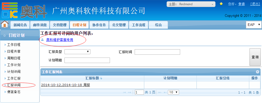 工作计划、工作汇报设置了“汇报对象”,则相关人员可评阅该工作计划、工作汇报: