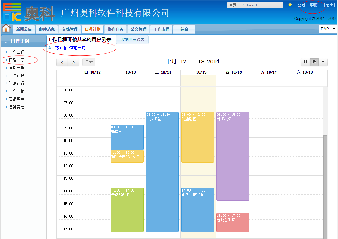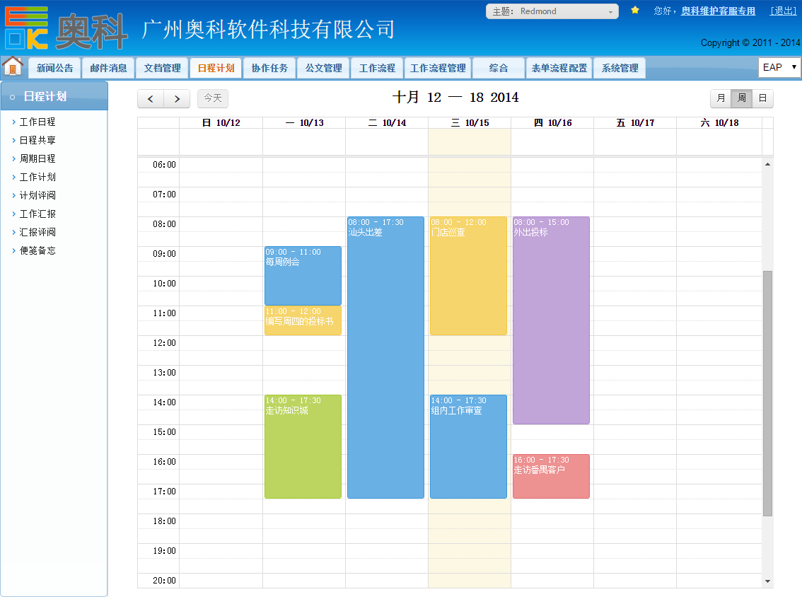 奥科OA协同办公平台内置的工作日程模块,采用精美的图形界面展示人员的工作日程安排: