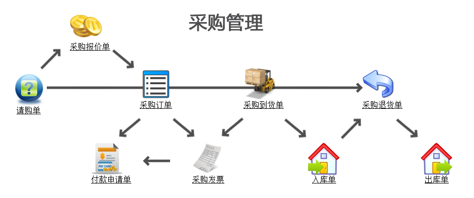 奥科供应链的采购管理主要包含了“采购任务”、“请购单”、“采购报价”、“采购订单”、“采购到货”、“采购入库”、“采购退货”、“采购发票”、“付款申请”等功能: